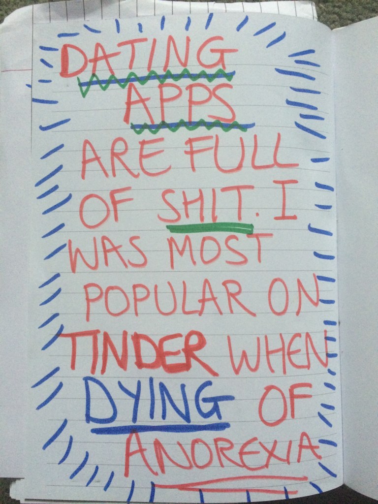 This messaging is almost impossible to avoid. Statistics show that overweight females are deemed less attractive than the opposite sex (Wang et al, 2015). Less attractive people are less likely to secure a partner, less likely to marry and less likely to have offspring. Children love you unconditionally and I want to one day have a family and to have this love, and so for me weight and love seem very linked. Obese people are more likely to die earlier and obesity is linked very closely to depression and low social-economic status and so fat is linked to physical and mental health and happiness and wealth. I don’t want to be unhappy, I don’t want to die young and I don’t want to be financially stressed and worrying about how to pay basic bills. My fear of fat is not about how I look. It is about my anxieties that my life will not go the way I hope it to and that I will not have the family, friends and security I so crave. It is about my fears that I will become bitter, disillusioned, alone and unhappy and I so do not want this. Fat scares me because I have a fear of losing my loved ones and of being alone (one of the most common fears according to Carleton, 2016) and of uncertainty, and the future is full of uncertainties. I fear the future, I fear falling through the glass flooring instead of breaking the glass ceiling. I fear never living up to my potential and my expectations of myself and I fear all my worst fears coming true and becoming a fat, alone, teacher (FAT) with no friends or family in a tiny flat as a depressed disabled person (crippled by osteoporosis from my anorexia), unable to add value to society. I fear being a burden on people and I fear that my life will spiral into the darkness and none of my dreams will come true.